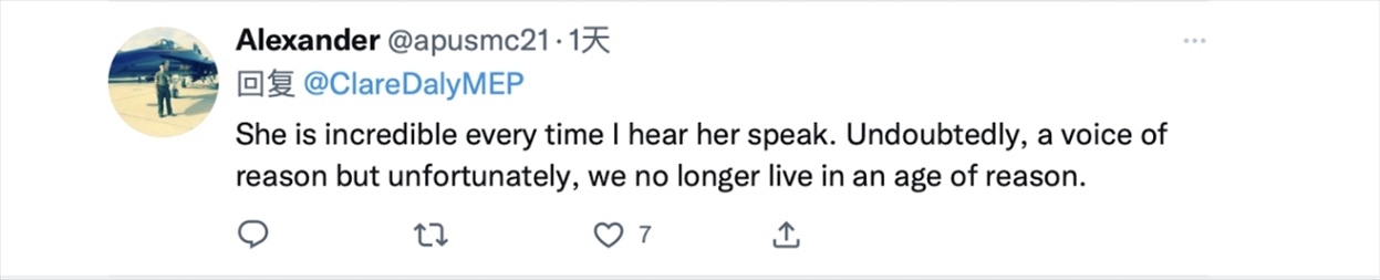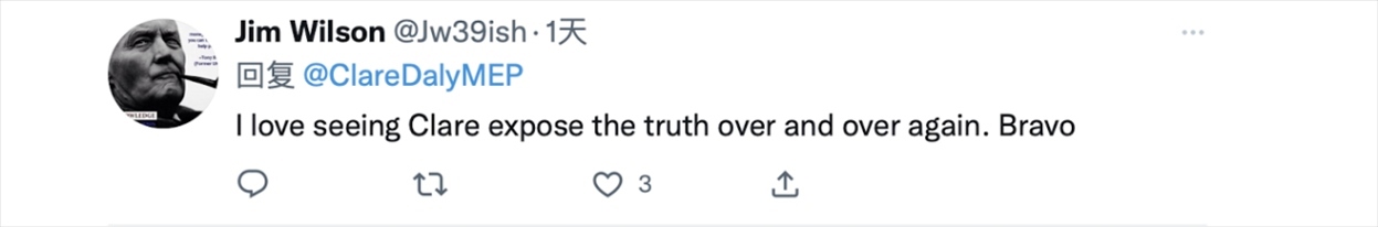 克萊爾·戴利的推文正是她在歐洲議會發(fā)言中所提到的內(nèi)容。在視頻中,克萊爾·戴利首先抨擊了西方對華問題上的雙標(biāo)行為。她在發(fā)言時稱,“人們在暴露分裂的同時談?wù)撝鴪F(tuán)結(jié),他們一邊在歐盟向?yàn)蹩颂m提供武器,一邊與中國談?wù)摵推?。他們哀嘆中國在臺灣地區(qū)‘挑釁’,但對美國干涉國際公認(rèn)的中國領(lǐng)土卻只字未提。”