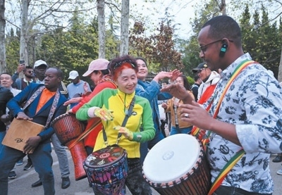 4月22日,在山東青島八大關街道,非洲青年代表與當地社區(qū)文藝隊成員熱情互動。本報記者 陳尚文攝