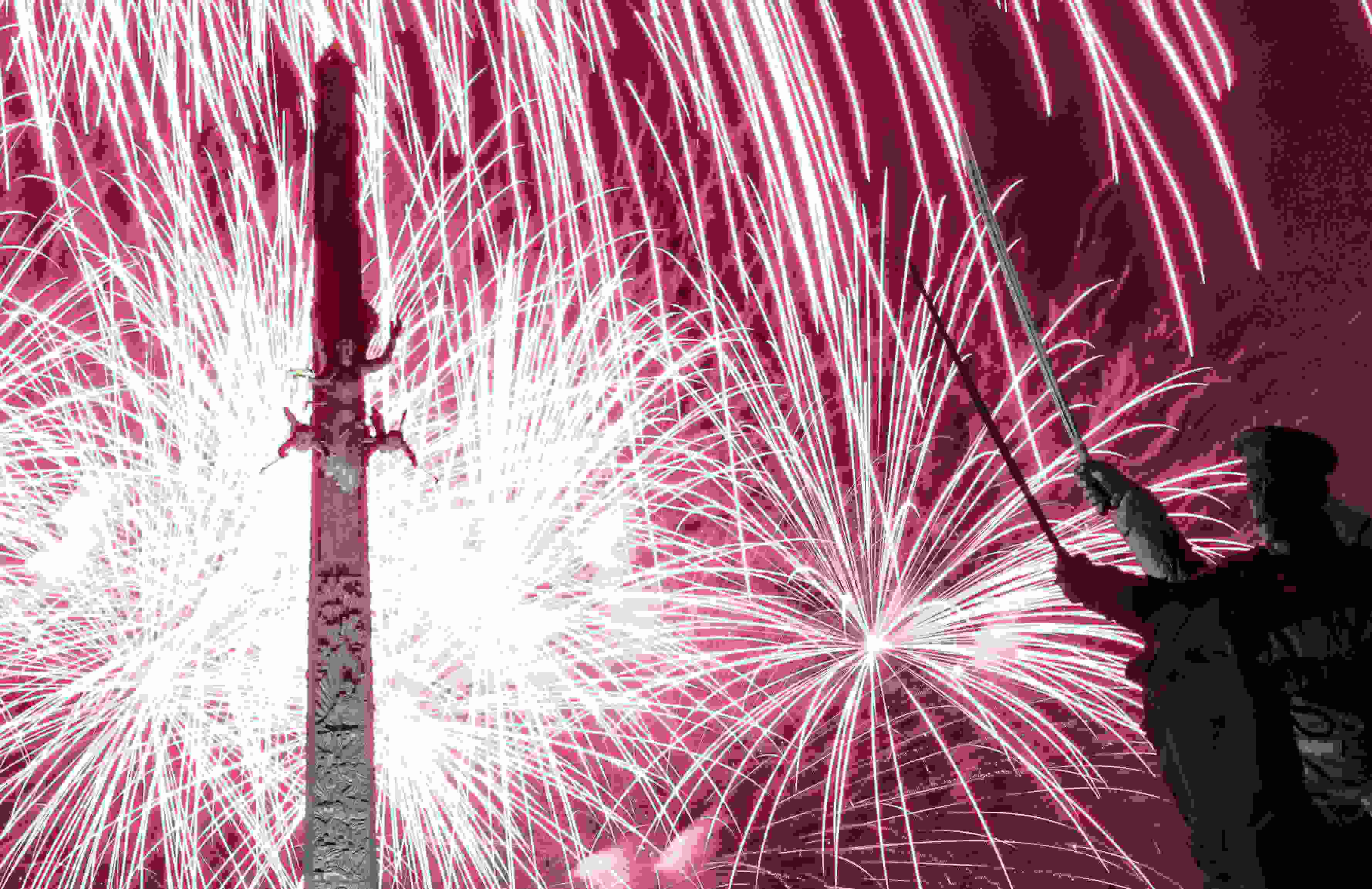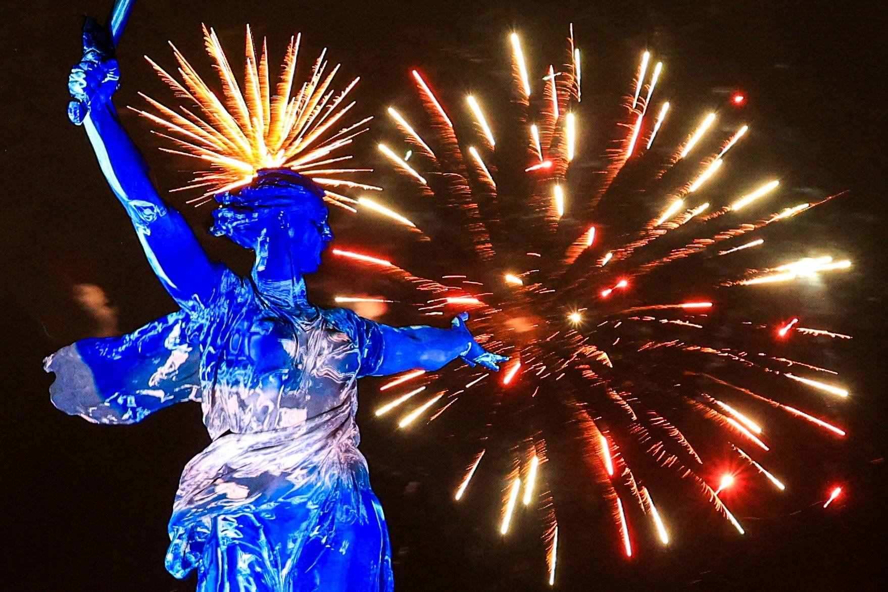 當(dāng)?shù)貢r(shí)間2023年5月9日,俄羅斯伏爾加格勒,紀(jì)念衛(wèi)國戰(zhàn)爭(zhēng)勝利78周年,煙花在馬馬耶夫山崗的祖國召喚雕像上綻放。