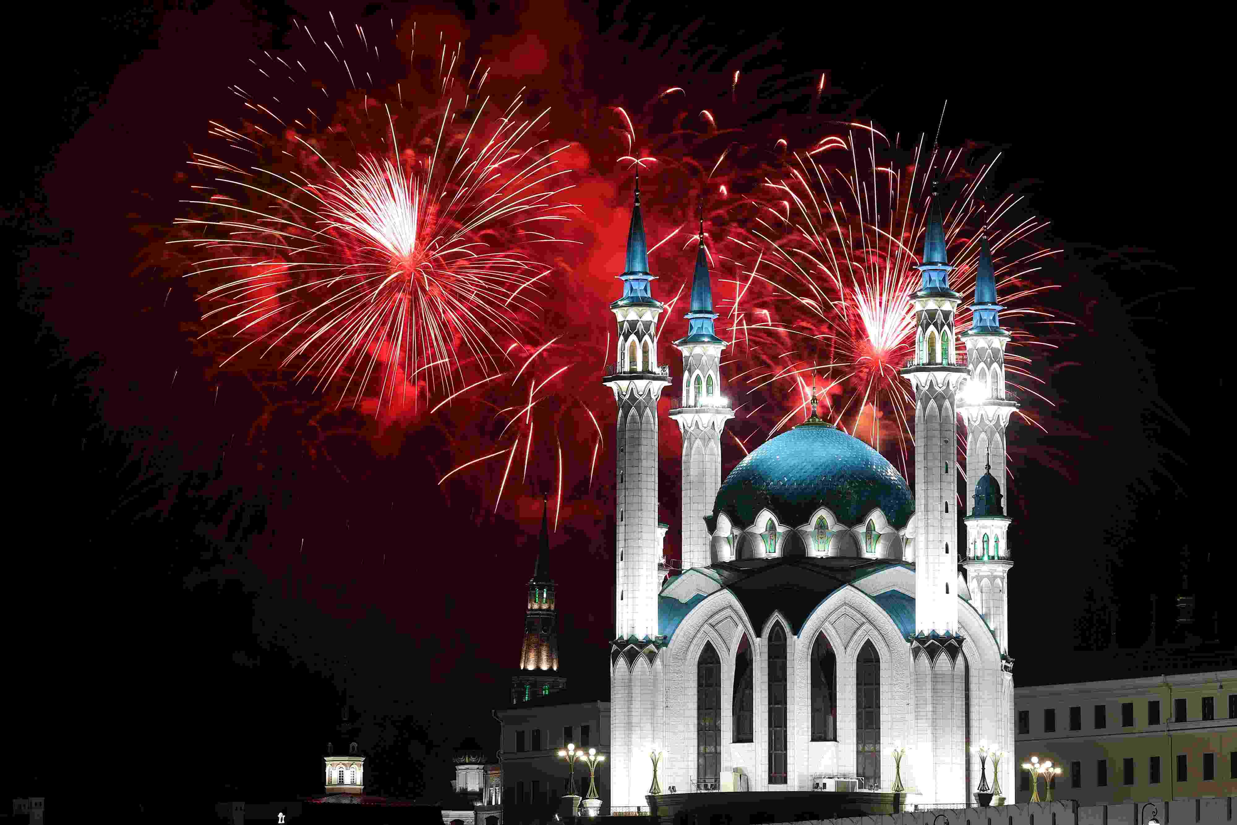 當(dāng)?shù)貢r(shí)間2023年5月9日,俄羅斯喀山,紀(jì)念衛(wèi)國戰(zhàn)爭(zhēng)勝利78周年,庫爾沙里夫清真寺燃放煙花。視覺中國