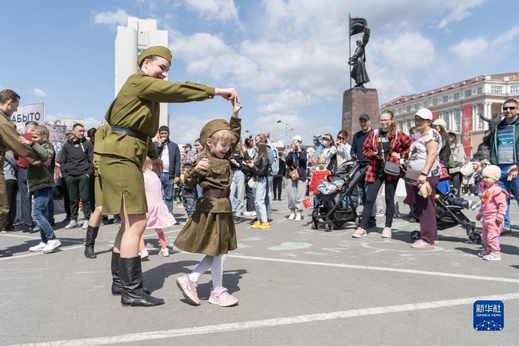 5月9日,在俄羅斯符拉迪沃斯托克,身穿模仿二戰(zhàn)時(shí)期蘇軍軍服的市民在廣場上跳舞。