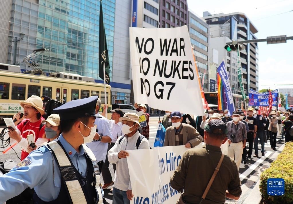 5月14日,在日本廣島街頭,日本民眾舉著“不要戰(zhàn)爭、不要核武器、不要G7”等標(biāo)語,強烈抗議七國集團(G7)峰會將在廣島召開。新華社記者 楊光 攝