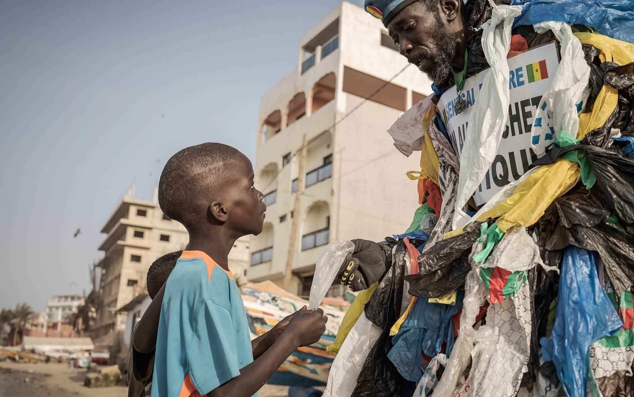 當?shù)貢r間2023年4月5日,塞內(nèi)加爾達喀爾,49歲的塞內(nèi)加爾環(huán)保活動家莫杜·法爾,被稱為“塑料人”,和一個孩子在海灘上散步時拿著一個塑料包裝,提醒人們注意使用一次性塑料的污染。