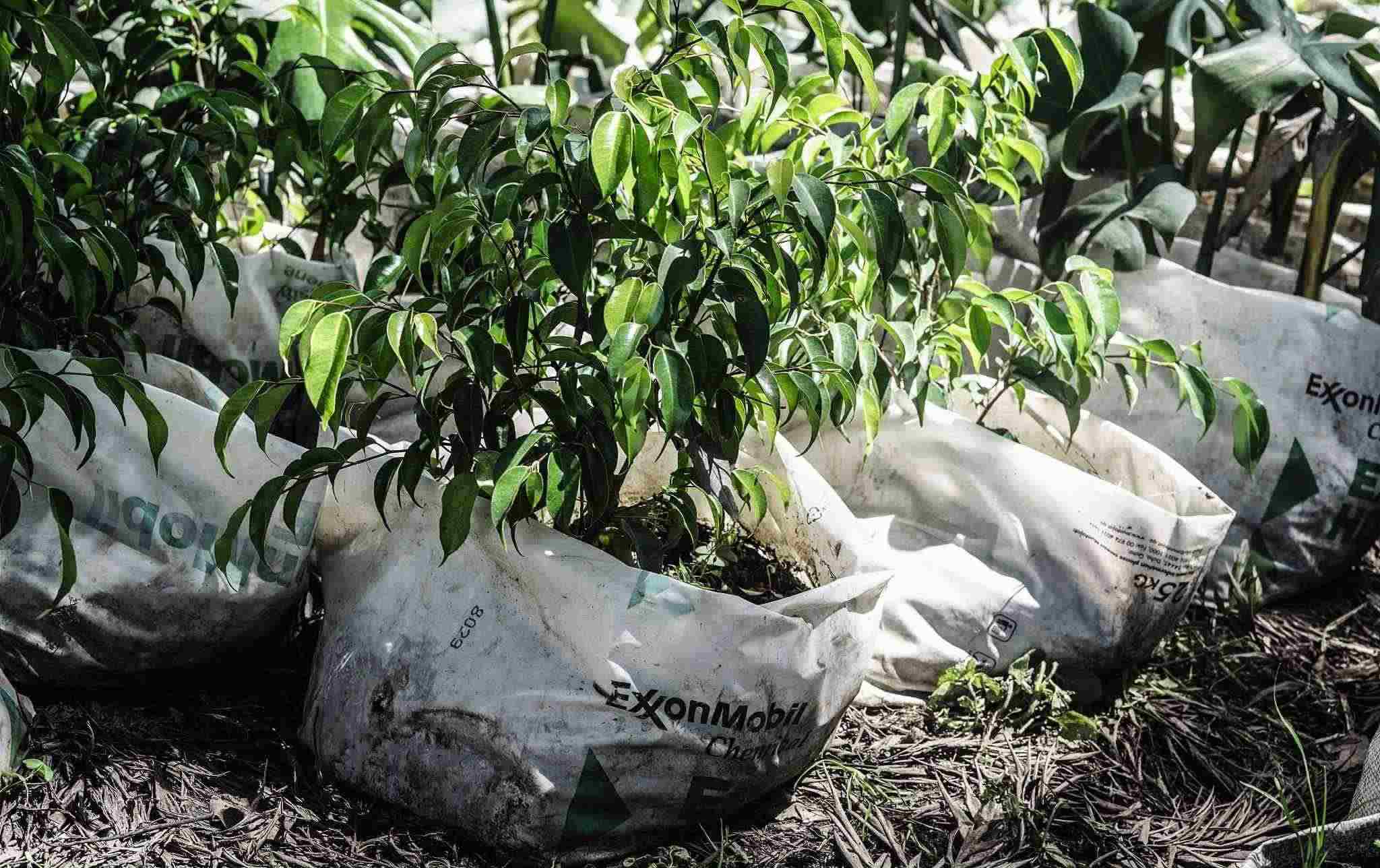 當?shù)貢r間2023年5月7日,肯尼亞納庫魯?shù)拿缙岳?,埃克森美孚包裝袋包裹著一棵樹苗。隨著世界充斥著塑料廢物,政府間談判委員會(INC)內(nèi)塑料條約的支持者正在倡導(dǎo)一項具有法律約束力的文書,減少石化工業(yè)生產(chǎn)的原生塑料。