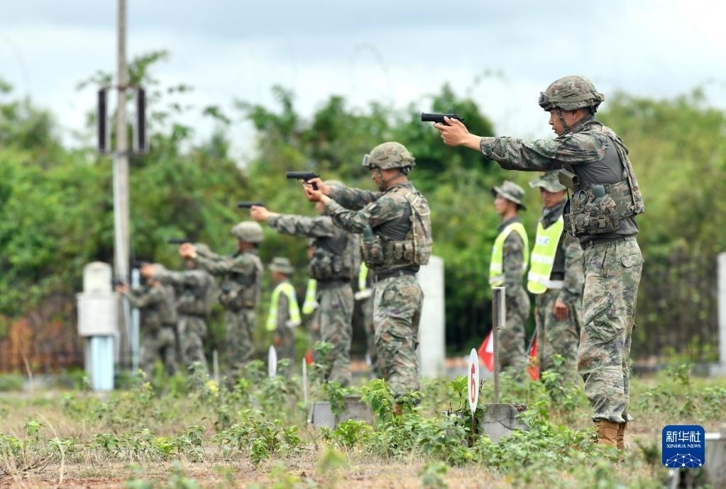 5月13日,在老撾人民軍庫瑪?shù)W(xué)院訓(xùn)練場,中方參演官兵進(jìn)行手槍射擊示范。