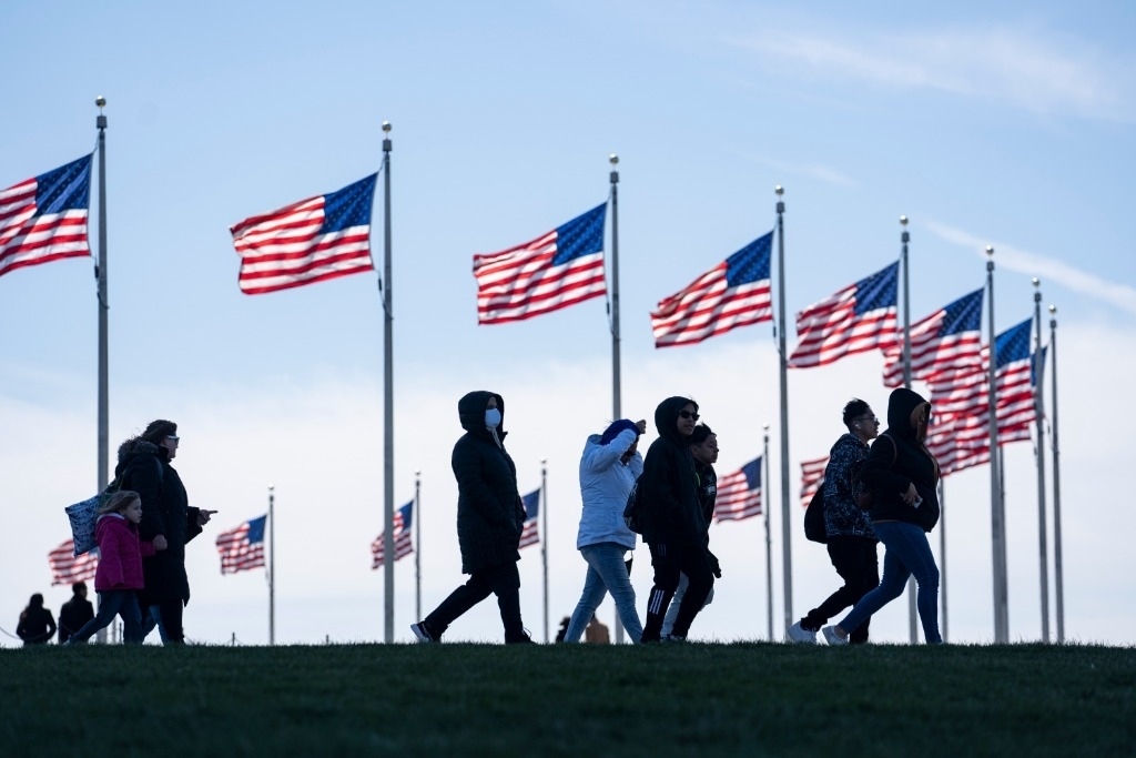 這是2022年3月29日,行人走在美國首都華盛頓的國家廣場。新華社記者劉杰攝