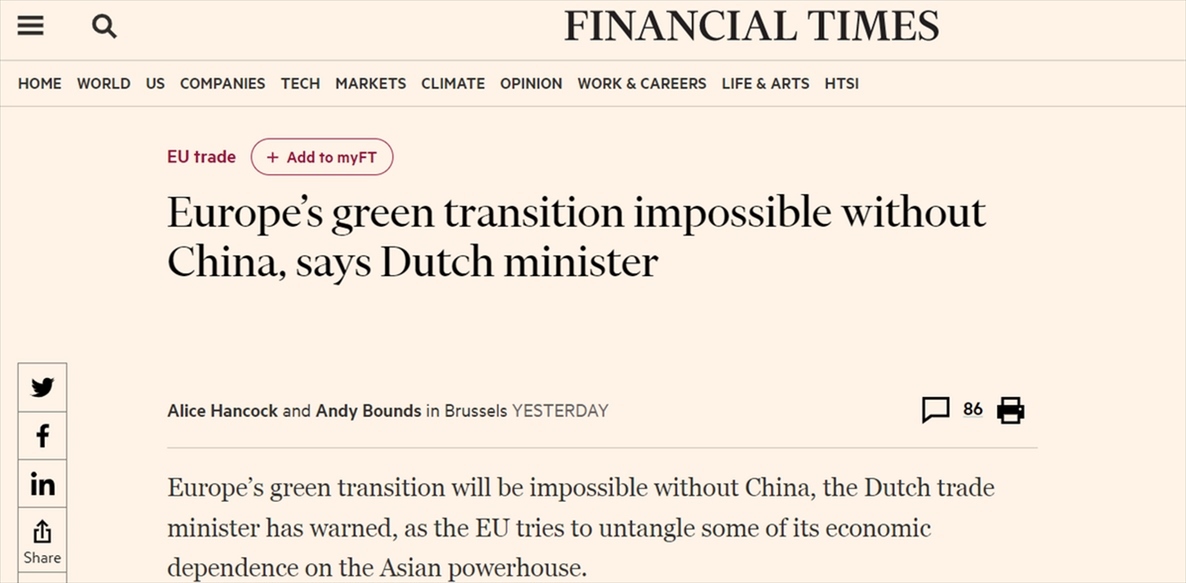 英國《金融時(shí)報(bào)》28日報(bào)道稱,荷蘭外貿(mào)與發(fā)展合作大臣施賴納馬赫爾警告稱,沒有中國,歐洲的綠色轉(zhuǎn)型將無法實(shí)現(xiàn)。