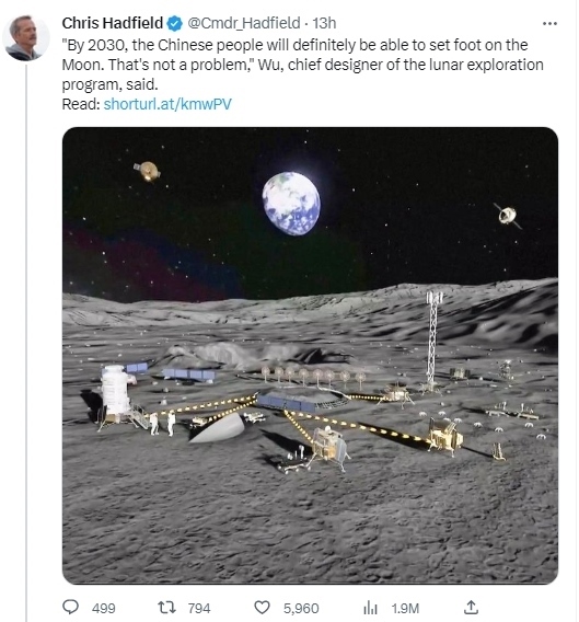 據(jù)報(bào)道,加拿大航天局前宇航員克里斯·哈德菲爾德在社交媒體推特上轉(zhuǎn)發(fā)了CGTN的一篇報(bào)道,他同時(shí)寫道,“中國(guó)探月工程總設(shè)計(jì)師吳偉仁說(shuō),‘到2030年,中國(guó)人的足跡一定能夠踏上月球。這不是個(gè)問(wèn)題?!?/p>