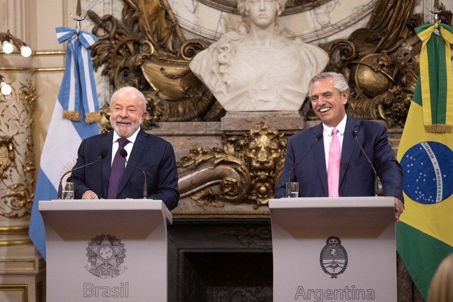 1月23日,在阿根廷布宜諾斯艾利斯,阿根廷總統費爾南德斯(右)和巴西總統盧拉在玫瑰宮出席新聞發(fā)布會。新華社發(fā)(馬丁·薩巴拉攝)
