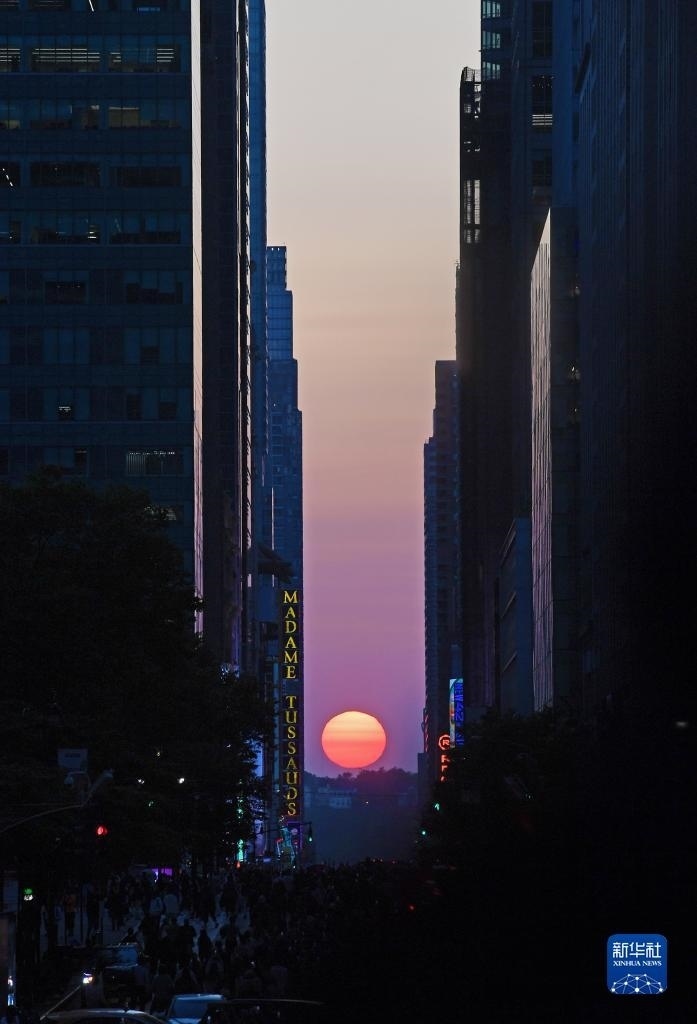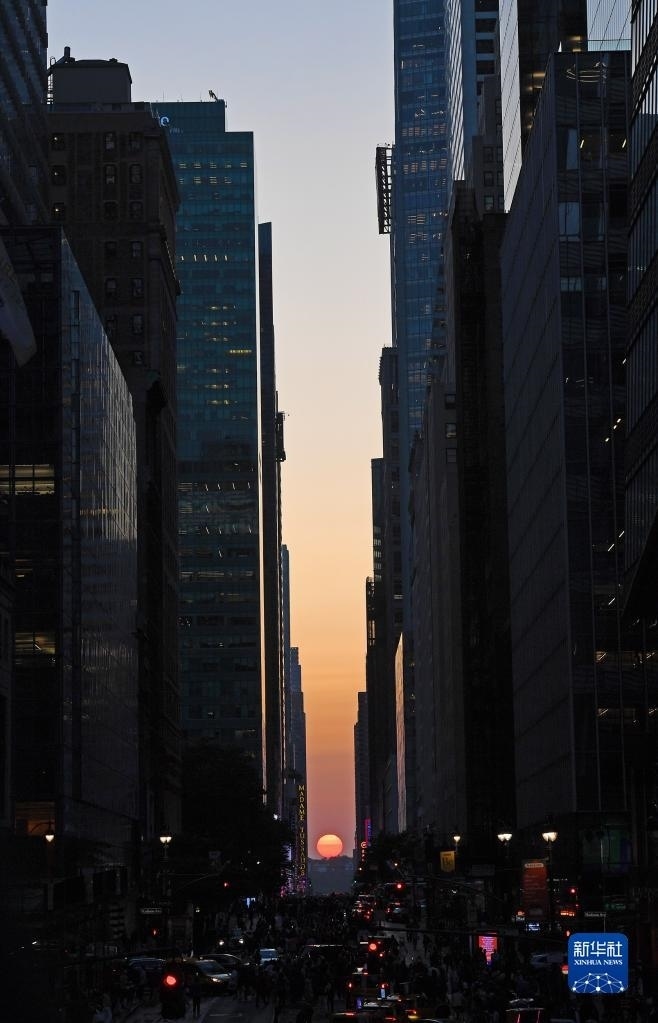 當(dāng)日,紐約出現(xiàn)“曼哈頓懸日”景觀?!奥D懸日”是紐約市標(biāo)志性景觀,每年5月和7月出現(xiàn)兩次,指日落時(shí)太陽(yáng)正好出現(xiàn)在曼哈頓東西向街道正上方、似乎懸在兩側(cè)高樓大廈之間的戲劇性畫面。新華社記者 李睿 攝
