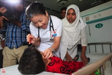 2013年,“和平方舟”號(hào)醫(yī)院船再次來(lái)到孟加拉國(guó)。上萬(wàn)民眾自發(fā)涌向中國(guó)醫(yī)院船,最高單日門(mén)診1700余人次。3歲的阿里法·沁健康么?中國(guó)軍醫(yī)牽掛著她。她家住在偏僻農(nóng)村,中國(guó)軍醫(yī)設(shè)法找到了她,邀請(qǐng)她登上“和平方舟”號(hào)醫(yī)院船體檢。