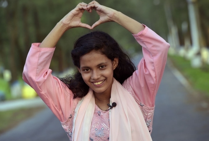 2023年5月26日,沁在孟加拉國(guó)做出愛(ài)心手勢(shì)表達(dá)對(duì)中國(guó)的愛(ài)意。新華社發(fā)