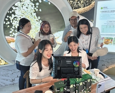 廣西橫州市茉莉花展館內(nèi),工作人員在直播展示茉莉花特色產(chǎn)品,東盟青年加入其中并向網(wǎng)友們問(wèn)好。本報(bào)記者 戴楷然攝