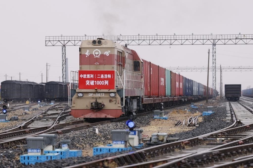 5月4日,一列中歐班列從二連浩特鐵路口岸駛出。新華社發(fā)(夏亮 攝)