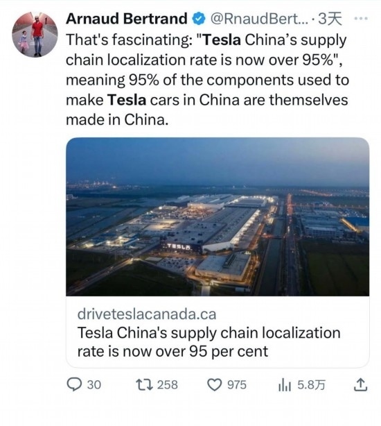 貝特朗還常為中國發(fā)展“點贊”。他在轉發(fā)特斯拉上海超級工廠新聞時由衷贊嘆:“真是太厲害了,這表示在中國生產(chǎn)特斯拉汽車所用的95%的零部件都是中國制造?!保▍⑴c記者:陳紹華、張曼;視頻:淡然、王沛;編輯:魯豫、王豐豐、杜逾舸、孫浩)