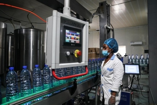 9月9日,當(dāng)?shù)貑T工在位于加蓬首都利伯維爾的歐來(lái)源純凈水廠生產(chǎn)線(xiàn)上工作。新華社記者韓旭攝