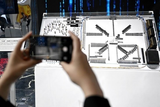 4月26日,觀眾在第二屆中國(安徽)科技創(chuàng)新成果轉(zhuǎn)化交易會上拍攝“九章”光量子計算原型機(jī)模型。新華社記者黃博涵 攝