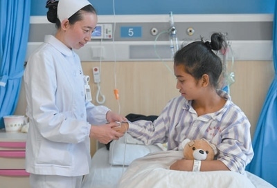 2018年6月,6名柬埔寨先心病患兒在云南省阜外心血管病醫(yī)院接受免費(fèi)治療。圖為護(hù)士為一名患兒檢查身體。任東攝
