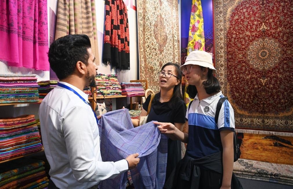 8月19日,參觀者在交流合作館吉爾吉斯斯坦展區(qū)了解特色商品。新華社記者 鄒競一 攝