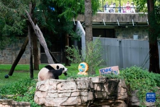 8月21日,游客在美國首都華盛頓史密森學(xué)會(huì)國家動(dòng)物園觀看大熊貓幼崽“小奇跡”過生日。新華社記者 劉杰 攝