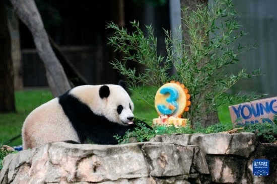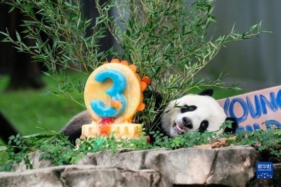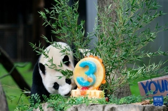 8月21日,大熊貓幼崽“小奇跡”在美國首都華盛頓史密森學(xué)會(huì)國家動(dòng)物園享用生日蛋糕。新華社記者 劉杰 攝