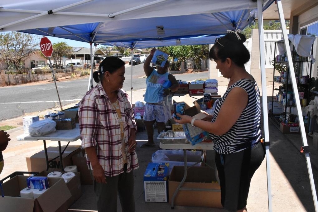 8月22日,在美國夏威夷州毛伊縣拉海納鎮(zhèn),埃爾琳達·拉梅布(右)分發(fā)救援物資。新華社發(fā)(曾慧攝)