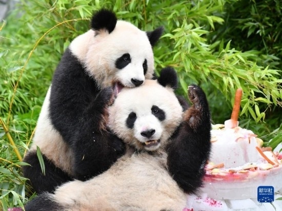 8月31日,大熊貓“夢(mèng)想”(左)和“夢(mèng)圓”在德國(guó)柏林動(dòng)物園享用“生日餐”。當(dāng)日,在德國(guó)出生的大熊貓雙胞胎兄弟“夢(mèng)想”和“夢(mèng)圓”迎來(lái)4歲生日,柏林動(dòng)物園為它們舉辦了慶祝活動(dòng)。新華社記者 任鵬飛 攝