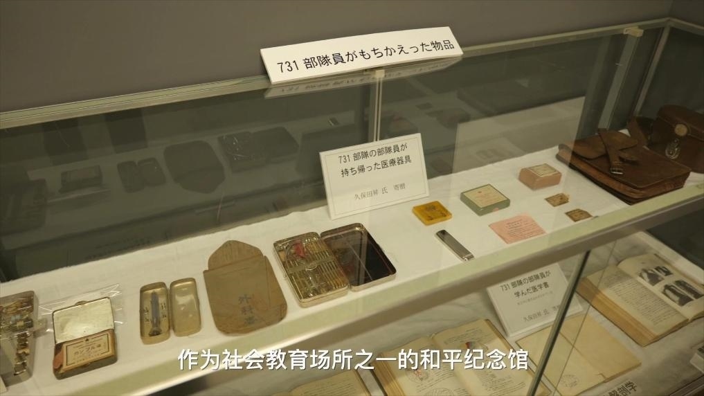 圖為飯?zhí)锸泻推狡砟铕^展廳內(nèi)展出的胡桃澤從731部隊帶回的手術器具等證物。(視頻截圖)