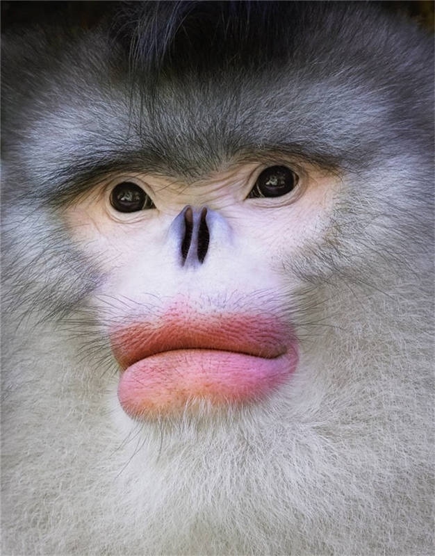 記得我和助手連續(xù)幾天反復(fù)登山,幾周后,我們終于發(fā)現(xiàn)了金絲猴。它們看起來就像做了整容手術(shù),有著大紅唇等獨(dú)特的特征。有一天,我順著山路,壓根沒在想金絲猴。突然,我發(fā)現(xiàn)在我腳邊,它正直視著我,我轉(zhuǎn)身按動快門,抓拍到那張近距離的動物肖像。
