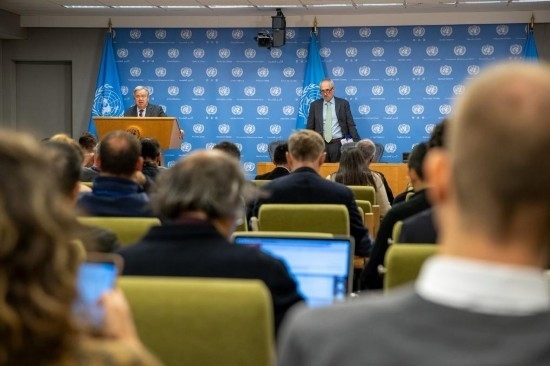 10月9日,在位于紐約的聯(lián)合國總部,聯(lián)合國秘書長古特雷斯(后左)在記者會(huì)上就巴以局勢發(fā)表談話。新華社發(fā)(聯(lián)合國供圖/保羅·菲爾蓋拉斯攝)