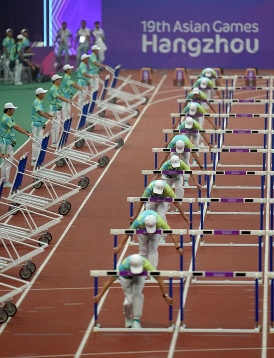 9月30日,杭州亞運會志愿者在田徑項目女子七項全能100米欄比賽前進(jìn)行場地準(zhǔn)備工作。新華社記者 江文耀 攝