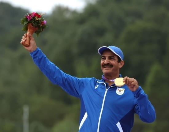 9月27日,金牌得主科威特選手阿卜杜拉·拉希迪在杭州亞運會射擊項目男子雙向飛碟個人賽頒獎儀式上。新華社記者 杜瀟逸 攝