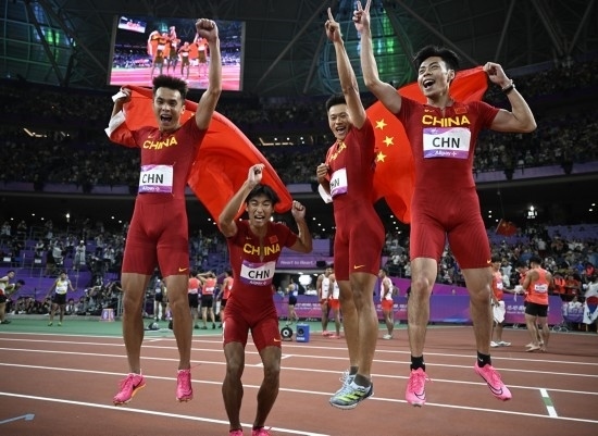 10月3日,中國選手陳冠鋒、謝震業(yè)、陳佳鵬、嚴(yán)海濱(從右至左)慶祝奪得杭州亞運會田徑項目男子4x100米接力冠軍。新華社記者 宋彥樺 攝