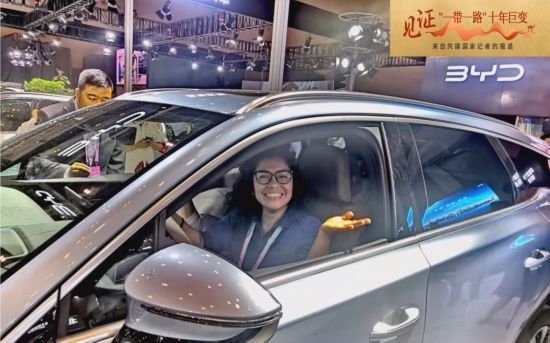 ▲ 記者在智博會(huì)體驗(yàn)中國(guó)新能源汽車(chē)