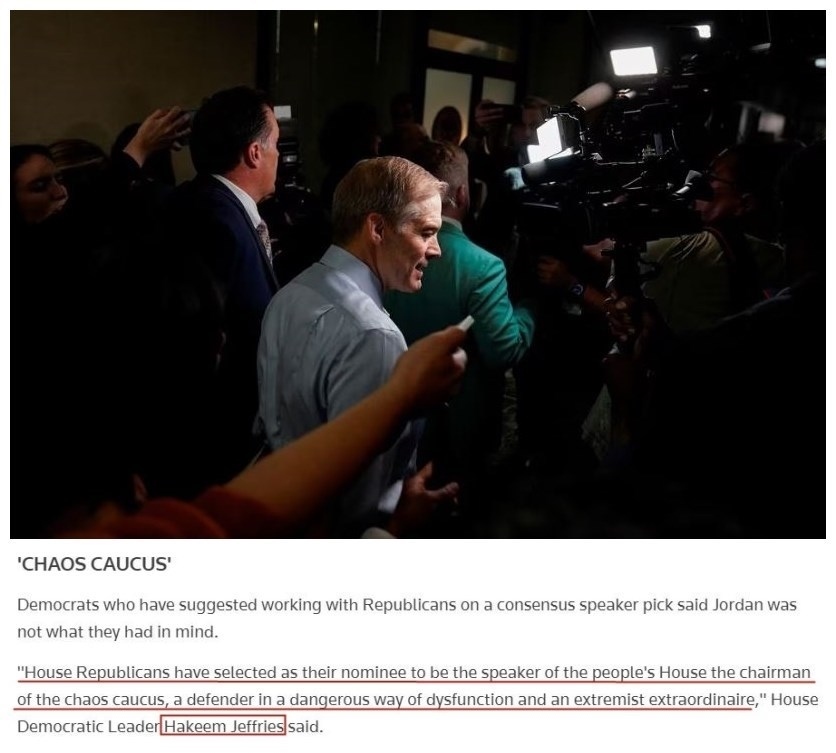作為民主黨議長候選人的眾議院少數(shù)黨領袖哈基姆·杰弗里斯13日警告,在眾議院共和黨人的“內(nèi)戰(zhàn)”仍在繼續(xù)的情況下,作為“極端主義者”的喬丹獲得提名只會讓國會變得“更加極端和混亂”。