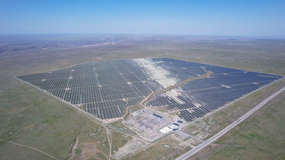 這是5月4日拍攝的哈薩克斯坦阿拉木圖州卡普恰蓋100兆瓦光伏電站(無(wú)人機(jī)照片)。這里的太陽(yáng)能光伏板通過(guò)中歐班列運(yùn)輸至此。
