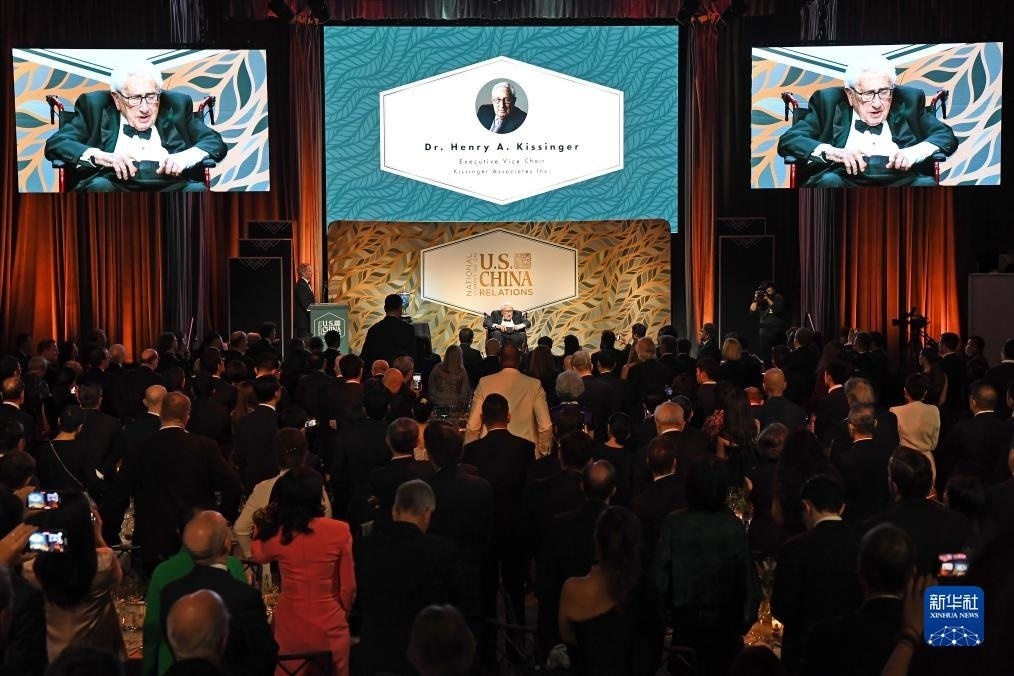 10月24日,美國前國務(wù)卿基辛格(中)在紐約舉行的美中關(guān)系全國委員會(huì)年度頒獎(jiǎng)晚宴上講話。新華社記者 李睿 攝