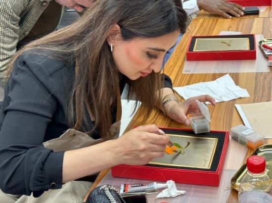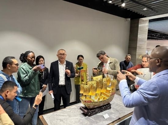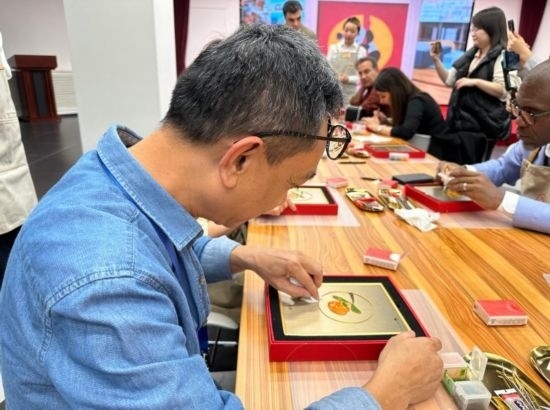 嘉賓在中國工藝集團體驗景泰藍制作過程 (新華社記者王艷剛攝)