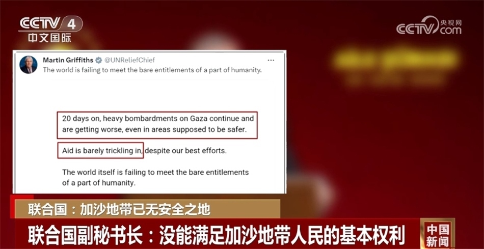 同一天,聯(lián)合國(guó)分管人道主義事務(wù)的副秘書(shū)長(zhǎng)馬丁·格里菲斯在社交媒體發(fā)文稱(chēng),在過(guò)去20天里,對(duì)加沙地帶的猛烈轟炸愈發(fā)嚴(yán)重,一些本該安全的地區(qū)也已經(jīng)陷入危險(xiǎn),但援助物資卻很難進(jìn)入加沙地帶,國(guó)際社會(huì)沒(méi)能滿足一部分人的基本權(quán)利。