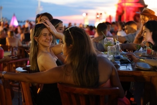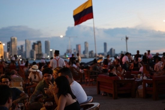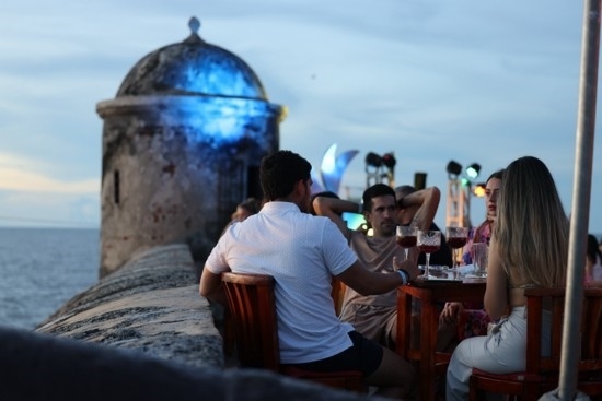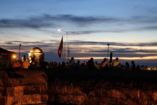 人們在卡塔赫納古城墻上的酒吧聚會,欣賞加勒比海落日。唐薇 攝