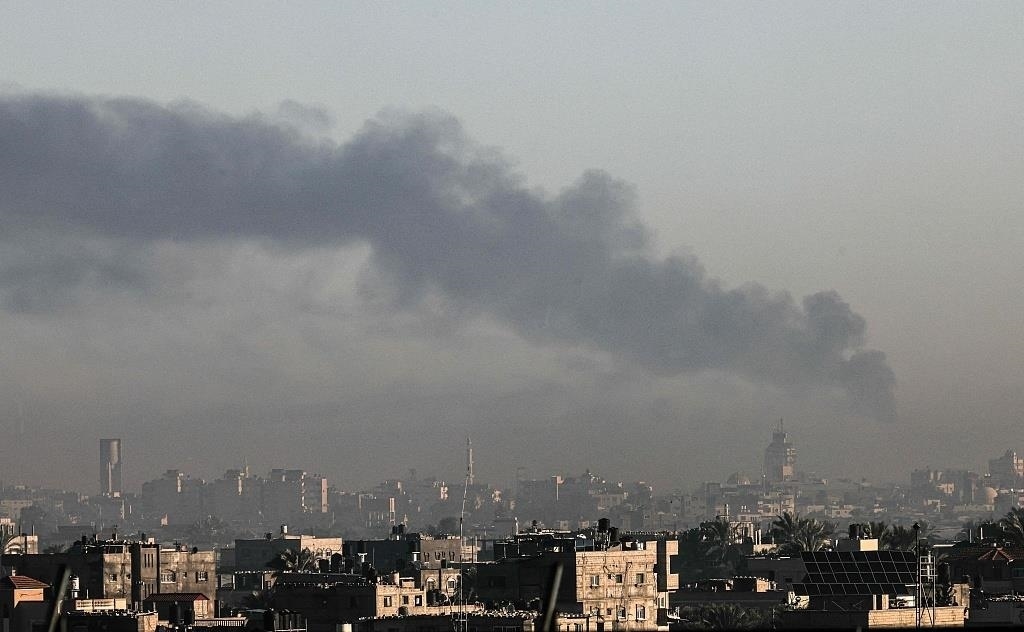 △當?shù)貢r間12月15日,以色列空襲過后,加沙地帶南部城市汗尤尼斯上空濃煙滾滾。