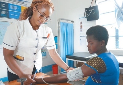 穆薩烏(左)為一名當(dāng)?shù)卦袐D測(cè)量血壓。本報(bào)記者 黃煒鑫攝