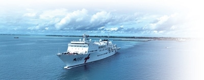 7月22日,正在執(zhí)行“和諧使命—2023”任務(wù)的中國(guó)海軍“和平方舟”號(hào)醫(yī)院船結(jié)束對(duì)基里巴斯的訪問(wèn)駛離塔拉瓦港。桂江波攝(新華社發(fā))