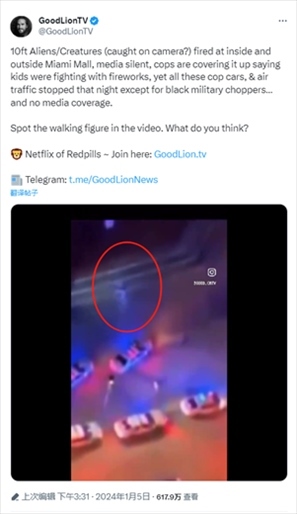 報(bào)道提到,一個(gè)推廣涵蓋科幻、陰謀論等內(nèi)容電影和紀(jì)錄片的X平臺(tái)賬號(hào)曬出現(xiàn)場(chǎng)視頻稱,“10英尺高的外星人/生物(被攝像機(jī)拍到?)朝邁阿密購物中心內(nèi)外開火,媒體沉默,警察掩蓋說孩子們?nèi)挤艧熁ú⒋蚨?,然而除了黑色軍用直升機(jī),所有警車和空中交通都在那天晚上一動(dòng)不動(dòng)……這卻沒有媒體報(bào)道。視頻中出現(xiàn)了行走的身影。你覺得呢?”↓