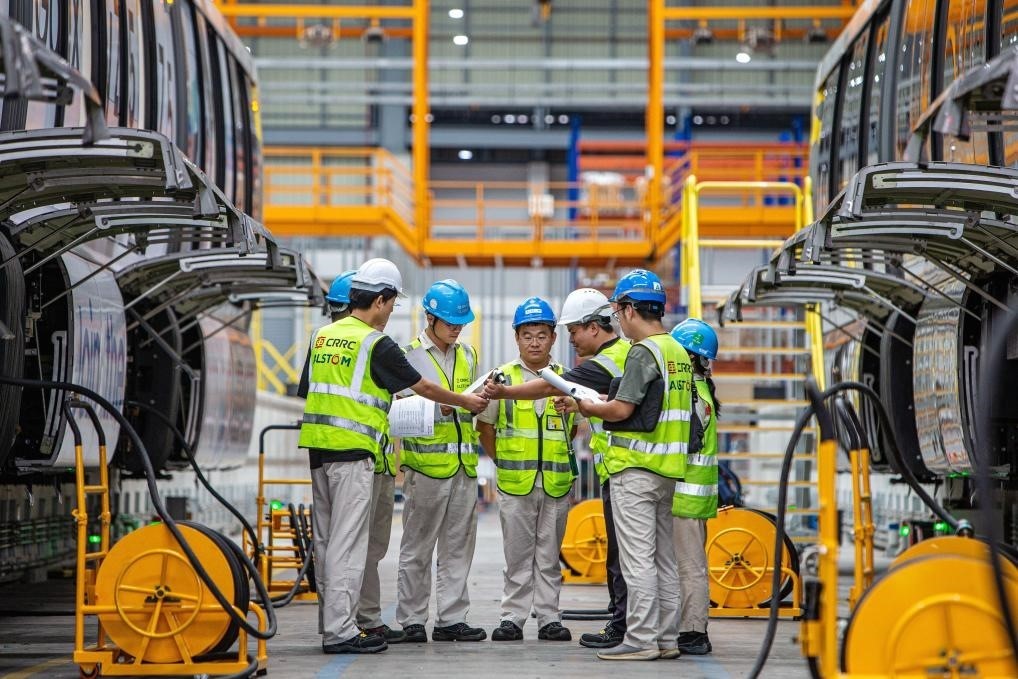 2023年9月22日,在泰國曼谷“黃線”列車維護中心,中車浦鎮(zhèn)阿爾斯通運輸系統(tǒng)有限公司工作人員檢修列車。新華社記者王騰攝