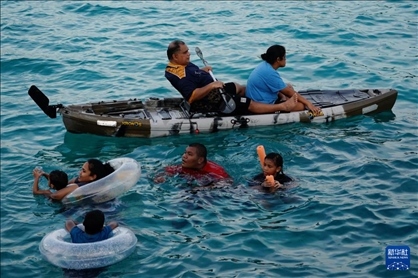 1月20日,瑙魯人在水中休閑娛樂(lè)。新華社記者 王申 攝