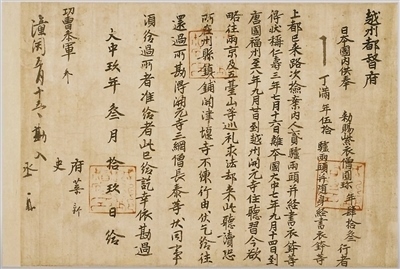 853年,圓珍入唐,先后在福州開(kāi)元寺、天臺(tái)山國(guó)清寺、長(zhǎng)安青龍寺等地修學(xué)。858年,圓珍攜大量經(jīng)卷、法器等回到日本,被尊為三井寺第一代住持,并成為日本天臺(tái)宗寺門(mén)派創(chuàng)始人。在唐求法期間,圓珍與各界人士結(jié)下深厚友誼。圓珍的親身經(jīng)歷以及他和唐朝人士的往來(lái)信件等,成為中日文化交流的歷史見(jiàn)證。