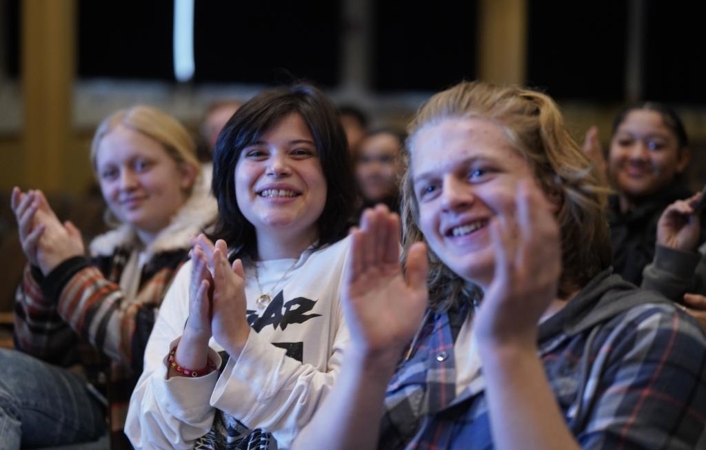 1月30日,在美國華盛頓州塔科馬市林肯中學(xué),將于3月啟程赴華交流的林肯中學(xué)12年級學(xué)生蒙特塞拉特·羅梅羅-羅查(中)參加美國中學(xué)生赴華交流歡送儀式。新華社記者 吳曉凌 攝