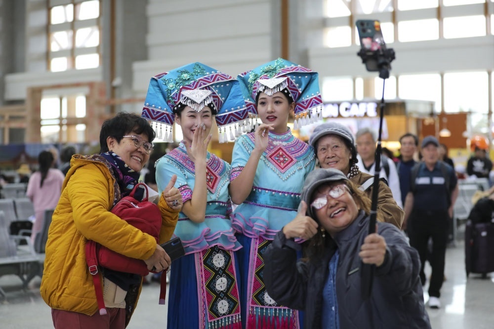 和謝先生一樣乘動(dòng)車跨境旅行的還有來自四川、湖南等地的300多名游客。