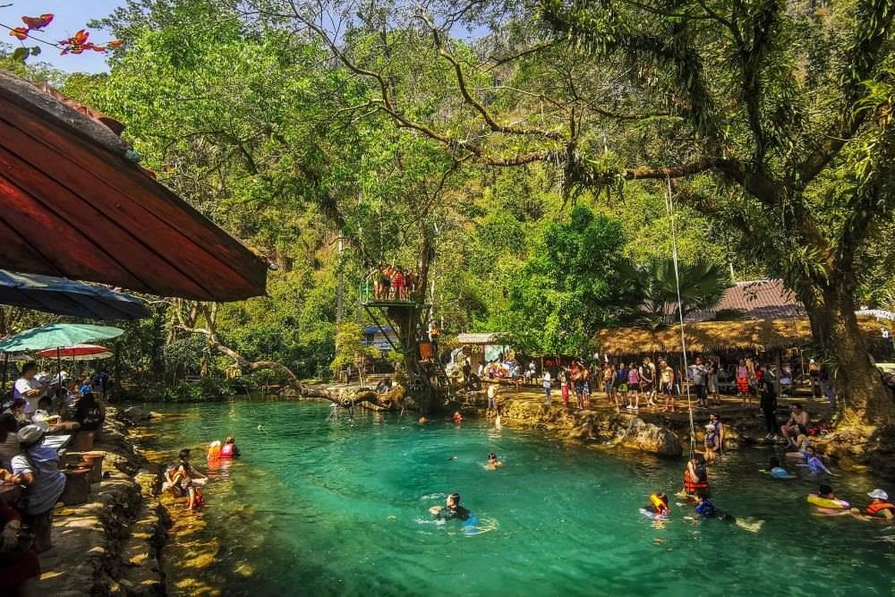 2月14日,中國游客在老撾萬榮藍(lán)色瀉湖游玩。